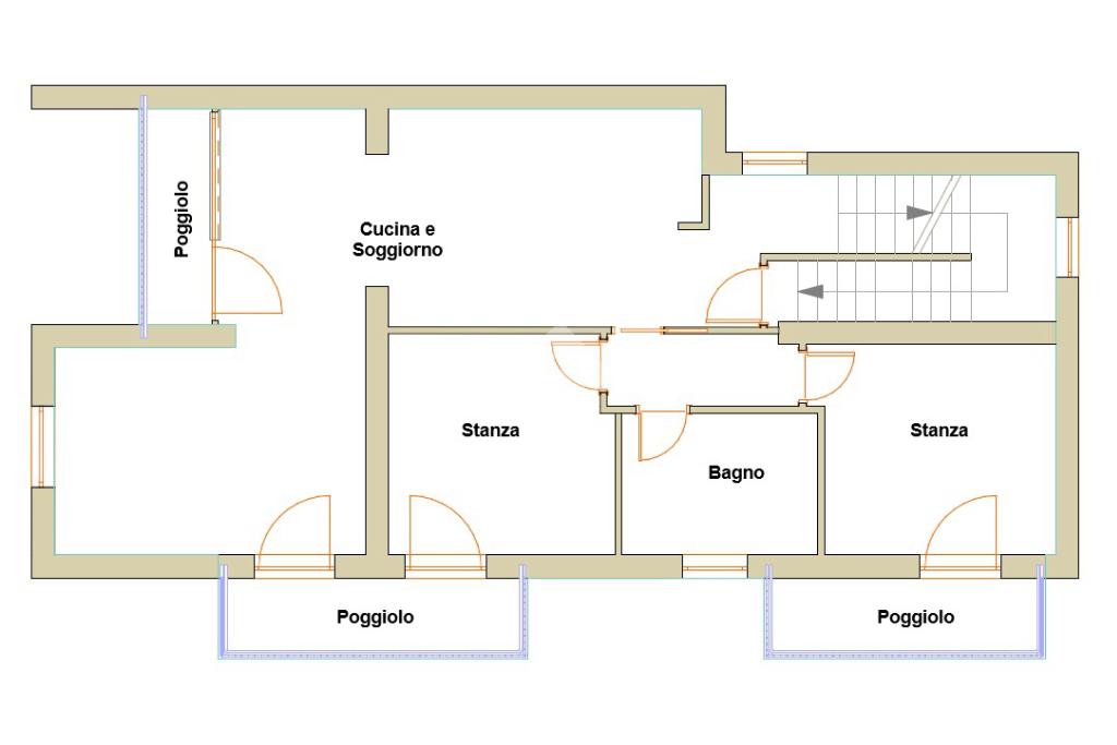 Primo piano: ingresso su una grande zona living, due camere matrimoniali, bagno finestrato e tre balconi con affaccio privilegiato sul paesaggio circostante.