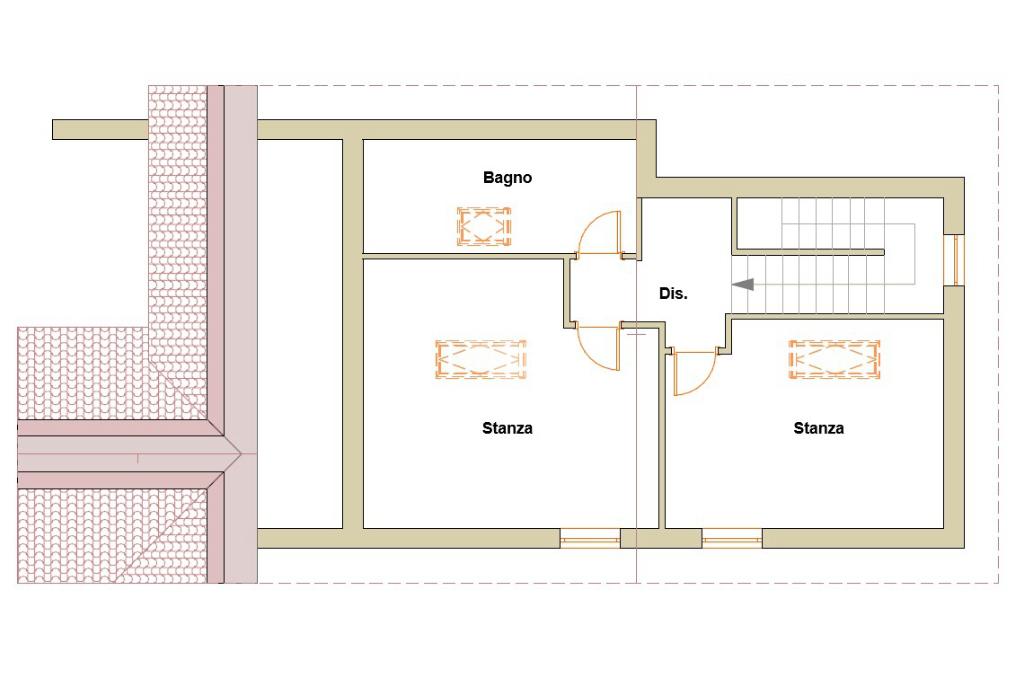 Secondo piano: ampia zona mansardata con travi a vista, composto da due camere matrimoniali e un grande bagno padronale dotato di box doccia.