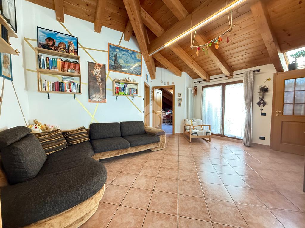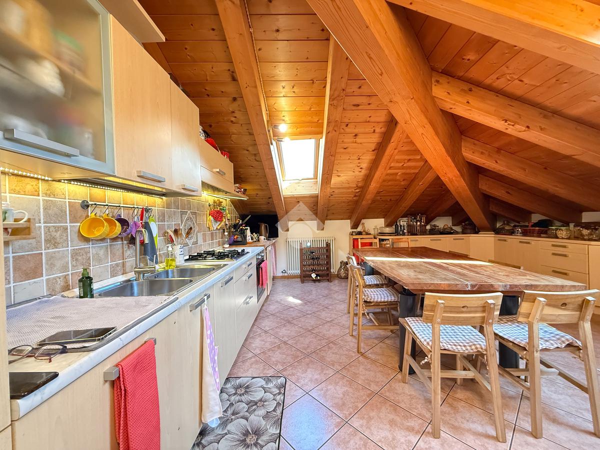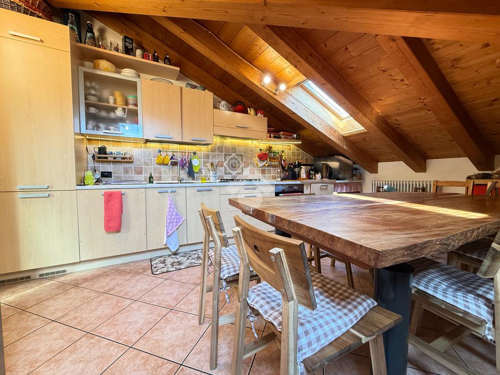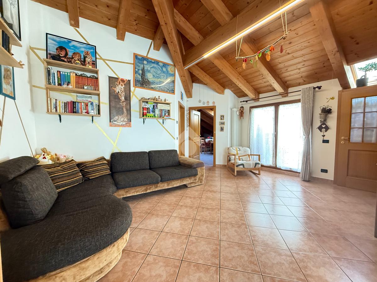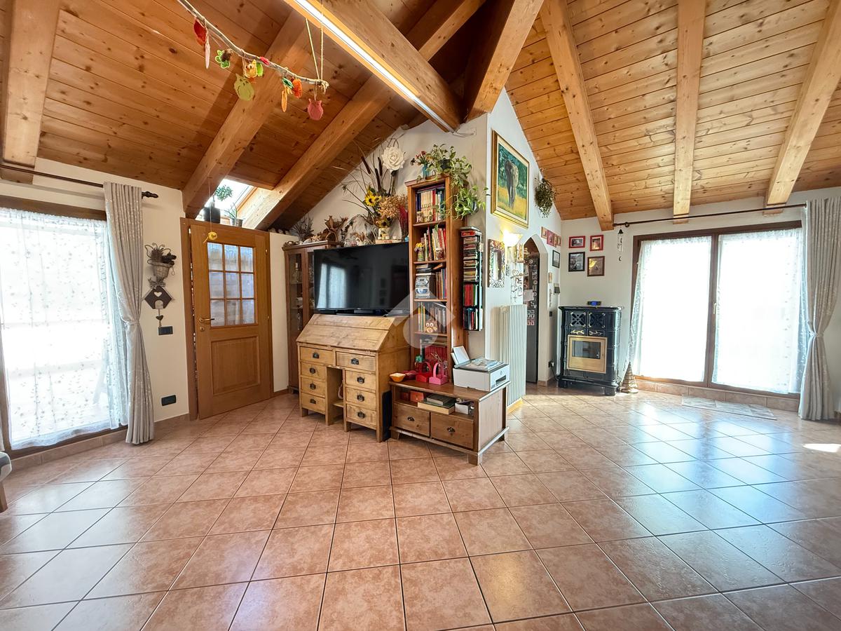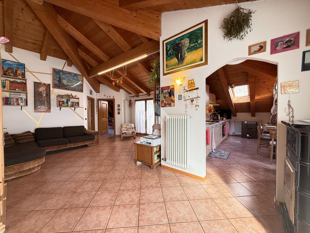Roveré della Luna - Nel centro del paese si propone in vendita un accogliente appartamento quadrilocale mansardato con travi a vista di 132 mq esposto su tre lati situato al quarto piano con ascensore di un edificio storico ristrutturato a fine anni novanta.