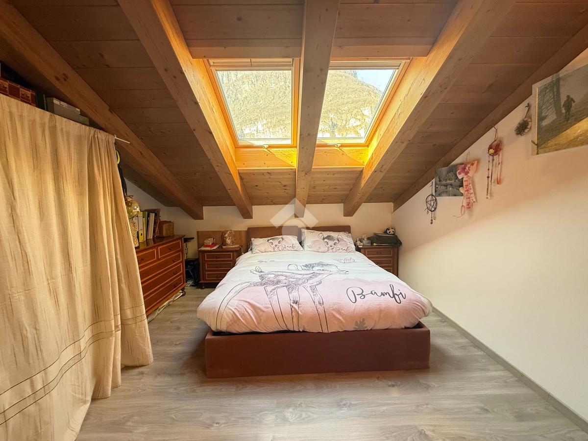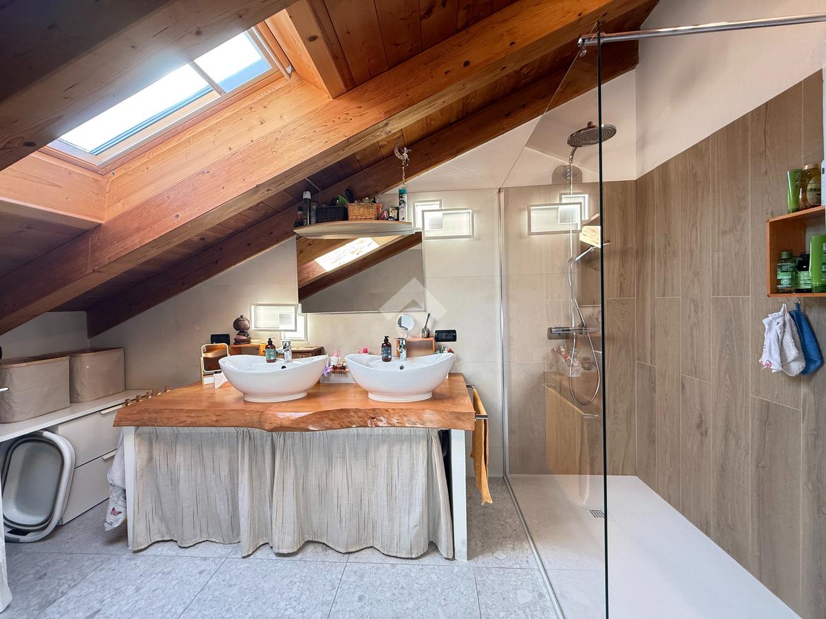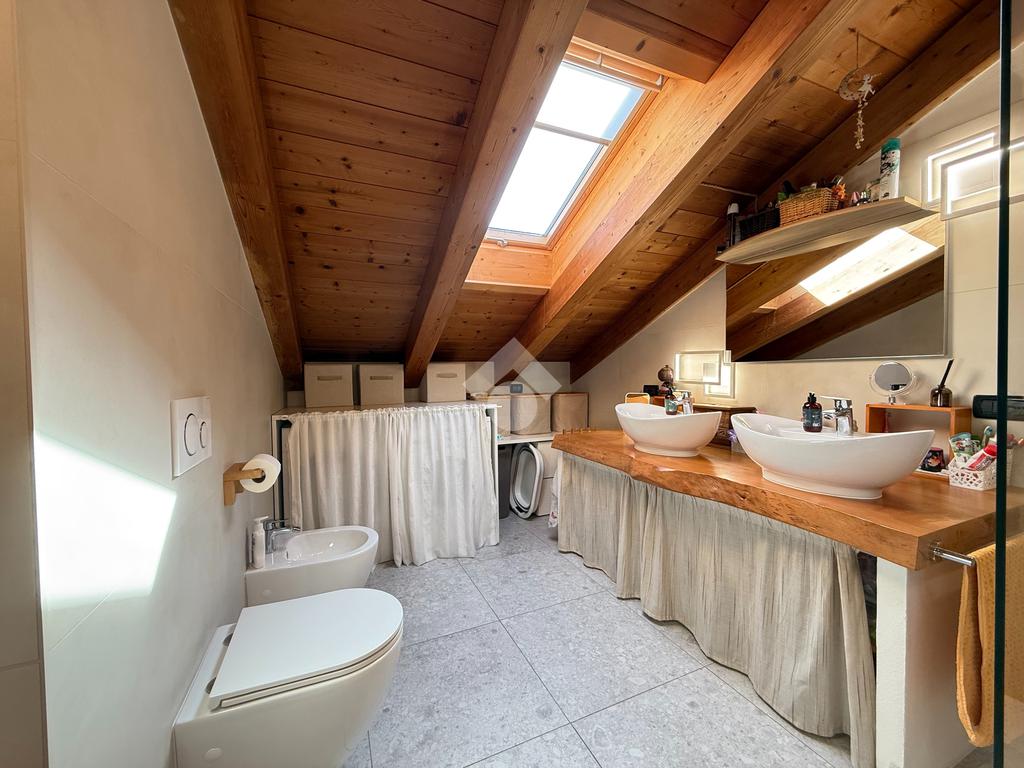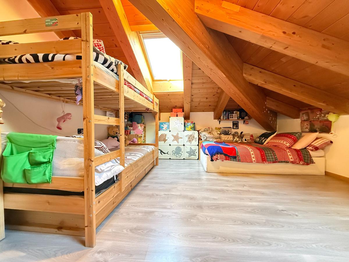 La zona notte è composta da due camere da letto illuminate da Velux di recente installazione e da un bagno, completamente ristrutturato nel 2025, finestrato e comprensivo di box doccia.
